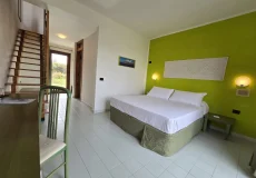 Spaziose camere situate al piano terra, con doppio ambiente con un letto matrimoniale e due letti singoli e salottino e soppalco da cui si accede ad un ampio terrazzo attrezzato.